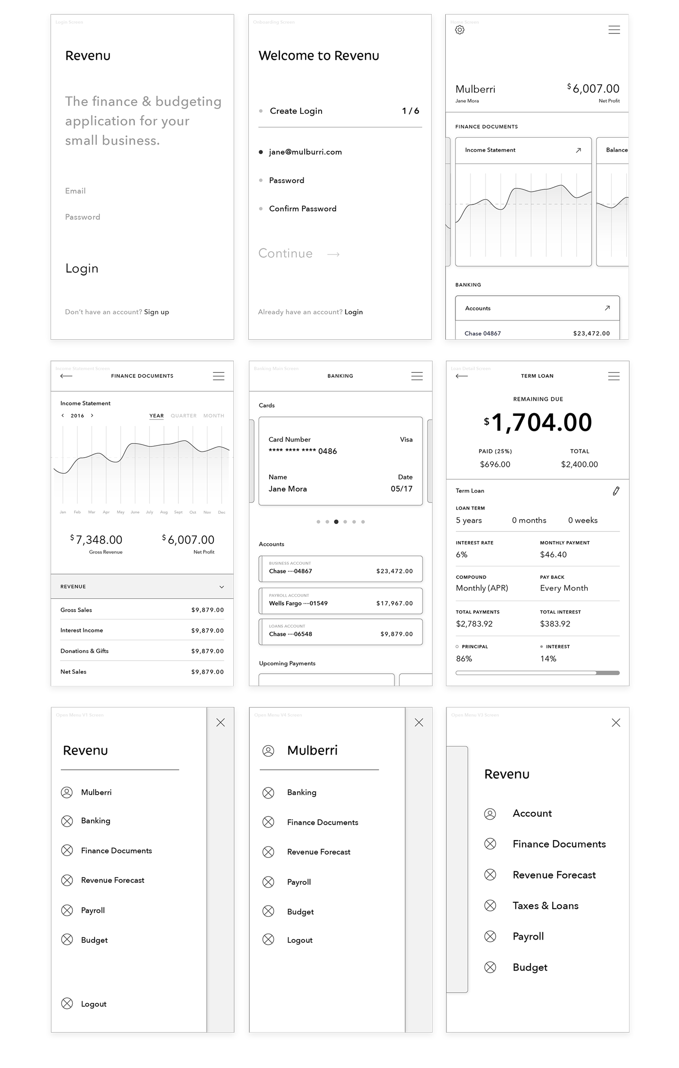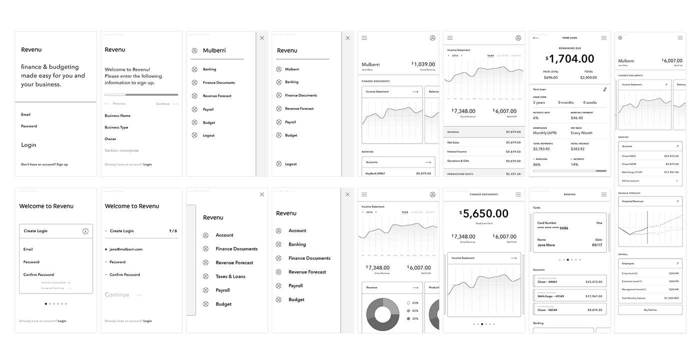 I spent most of my iterative process in the wireframing stage. Since this was a topic I was unfamiliar with, seeing as I myself don't run a business, I felt it was important to get my information design to a solid and visual pleasing point in black and white before adding color.
